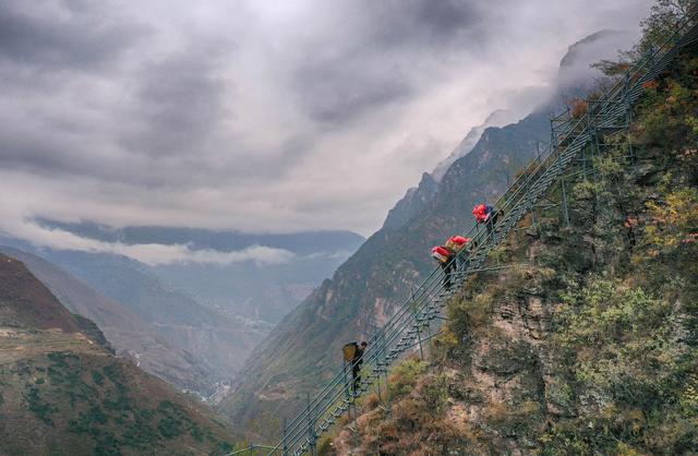 某色蘇不惹(中)和同伴在鋼梯上休息,他們正通過鋼梯把修民宿的樹脂瓦往村里背。