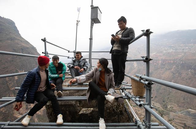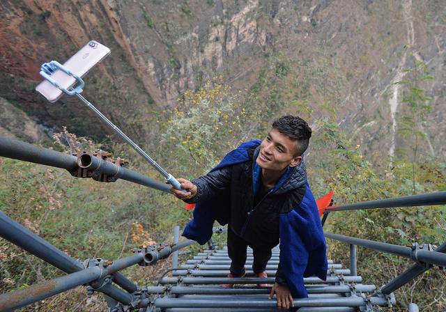 某色蘇不惹在通往懸崖村的鋼梯上直播(2017年12月15日攝)。