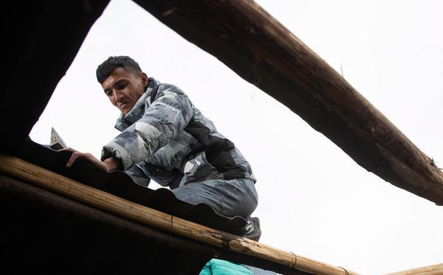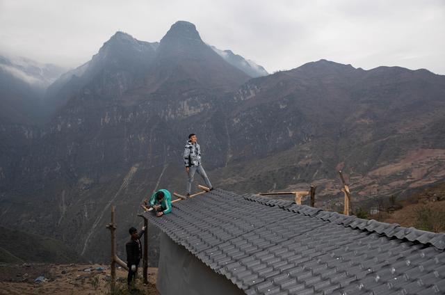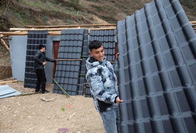 12月23日,某色蘇不惹(右)和同伴在懸崖村蓋樹脂瓦做的民宿。