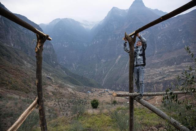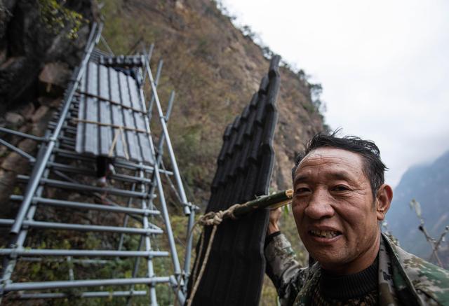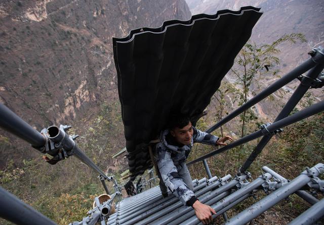 12月23日,滿頭大汗的懸崖村村支書某色吉日通過鋼梯把修民宿的樹脂瓦往村里背。