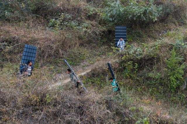 12月23日,某色蘇不惹(右一)和同伴背著修民宿的樹脂瓦往村里走(無人機(jī)照片)。